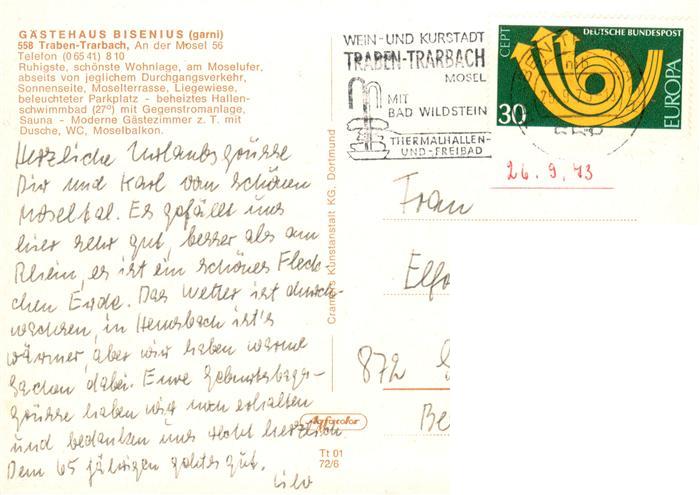 73896445 Traben-Trarbach Mosel Gaestehaus Bisenius garni Gaststube Hallenbad Terrasse postalisch gelaufen Erhaltung siehe scans [WerneD78] alte Postkarte Wern Katcode 11110007231124