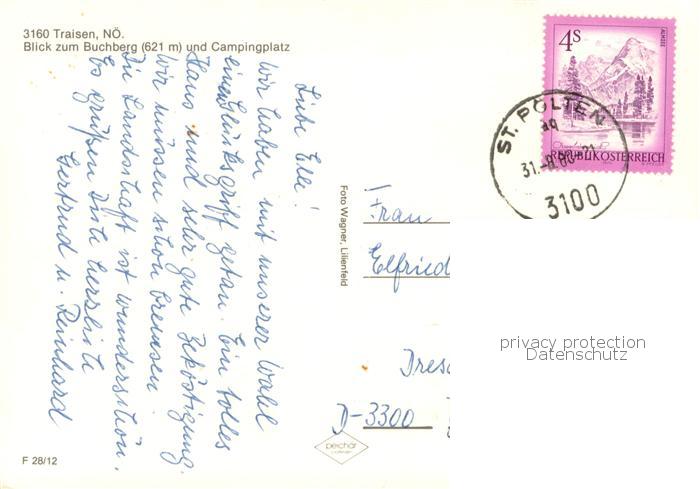 73751899 alte Postkarte Traisen Niederoesterreich Blick zum Buchberg und Campingplatz Fliegeraufnahme postalisch gelaufen Erhaltung siehe scans [WerneD78] KatCode: 11390122031413