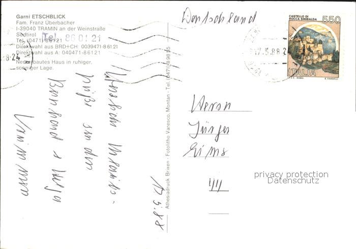 old postcard Tramin Weinstrasse Garni Etschblick Hotel Pension postalisch gelaufen Erhaltung siehe scans