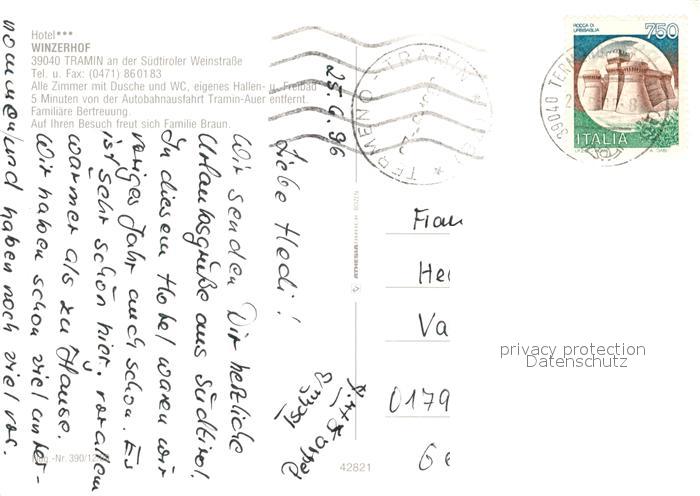 old postcard Tramin Weinstrasse Hotel Winzerhof postalisch gelaufen Erhaltung siehe scans [KathaD81]