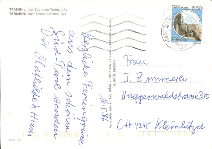 old postcard Tramin Weinstrasse Ortsansicht mit Kirche Suedtiroler Weinstrasse Strada del Vino postalisch gelaufen Erhaltung siehe scans
