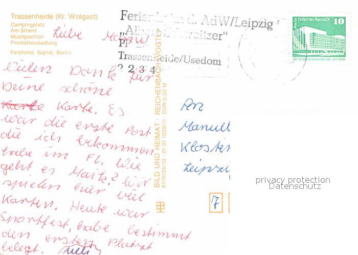 72654303 alte Postkarte Trassenheide Usedom Campingplatz Strand Musikpavillon Finnhuettensiedlung postalisch gelaufen Erhaltung siehe scans [WerneD78] KatCode: 11110013059095