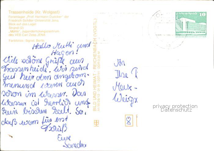 72337034 alte Postkarte Trassenheide Usedom Ferienlager Duncker der Universitaet Jena Strand Windmuehle Jugenderholungszentrum postalisch gelaufen Erhaltung siehe scans KatCode: 11110013059095