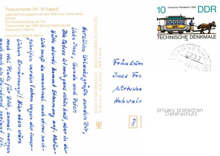 72843947 alte Postkarte Trassenheide Usedom Finnhuetten Windmuehle Strand postalisch gelaufen Erhaltung siehe scans [AndreD76] KatCode: 11110013059095