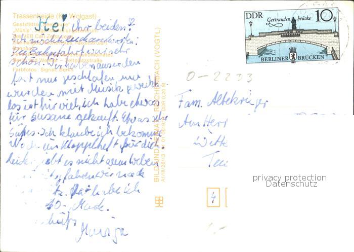 72337035 alte Postkarte Trassenheide Usedom Gaststaette Seeklause Muehle Jugenderholungszentrum ehem. Fischerhaus Bahnhof Finnhuetten postalisch gelaufen Erhaltung siehe scans KatCode: 11110013059095