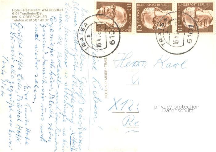 73716147 alte Postkarte Trautheim Hotel Restaurant Waldesruh Terrasse Gastraeume postalisch gelaufen Erhaltung siehe scans [WerneD78] KatCode: 11110006432014