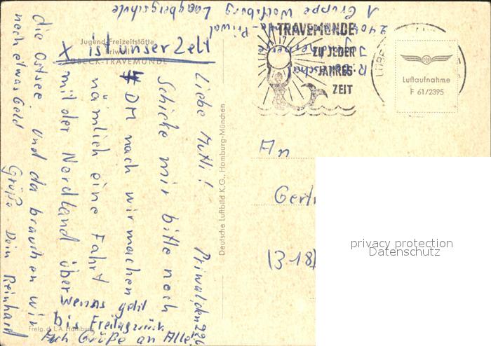 72129942 alte Postkarte Travemuende Ostseebad Fliegeraufnahme Camping postalisch gelaufen Erhaltung siehe scans KatCode: 11110001003000