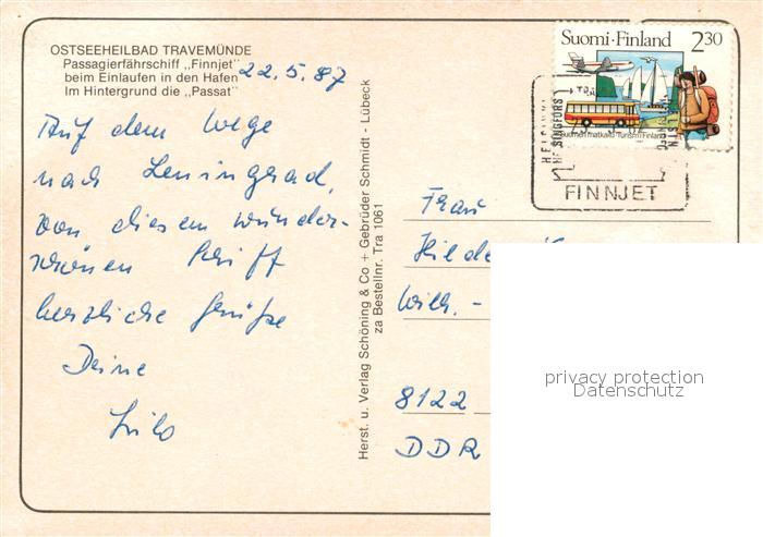 73704883 alte Postkarte Travemuende Ostseebad Fliegeraufnahme mit Passagierschiff Finnjet beim Einlaufen in den Hafen mit Segelschiff Passat postalisch gelaufen Erhaltung siehe scans [WerneD78] KatCode: 11110001003000