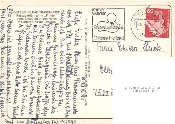 73322276 alte Postkarte Travemuende Ostseebad Fliegeraufnahme Passagierschiff Finnjet postalisch gelaufen Erhaltung siehe scans [KathaD81] KatCode: 11110001003000