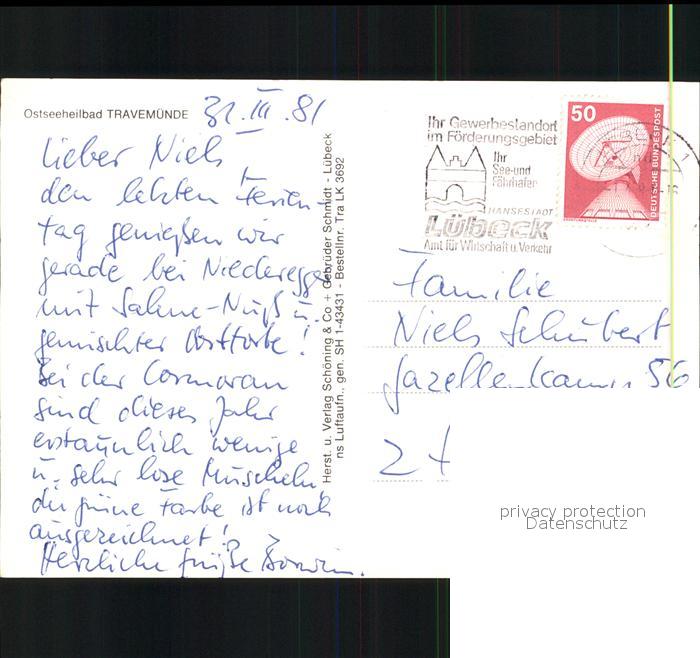 71984305 alte Postkarte Travemuende Ostseebad Ostseeheilbad Hafen Segelschiff Fliegeraufnahme postalisch gelaufen Erhaltung siehe scans KatCode: 11110001003000