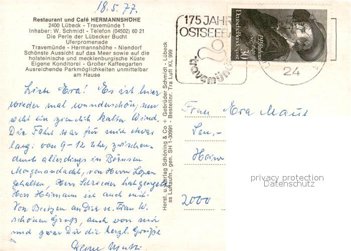 73685330 alte Postkarte Travemuende Ostseebad Restaurant Cafe Hermannshoehe Fliegeraufnahme postalisch gelaufen Erhaltung siehe scans [WerneD78] KatCode: 11110001003000
