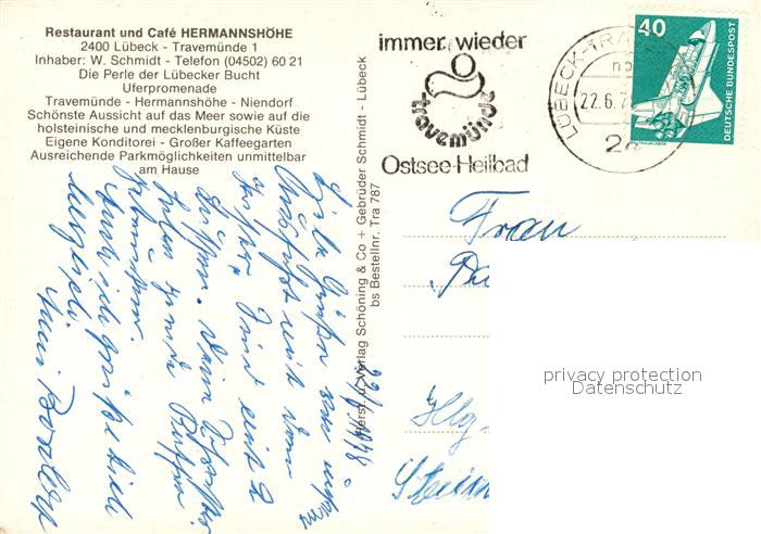 73216529 alte Postkarte Travemuende Ostseebad Restaurant Cafe Hermannshoehe Meerblick Fliegeraufnahme postalisch gelaufen Erhaltung siehe scans [FriedD77] KatCode: 11110001003000