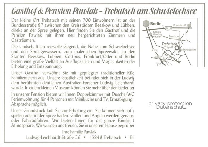 73754928 Trebatsch Gasthof Pension Pawlak am Schwielochsee Bootsanlegestelle postalisch nicht gelaufen Werbekarte (keine Postkarte) Erhaltung siehe scans [FriedD77] KatCode: 11110012067493