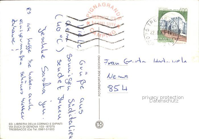old postcard Trebisacce Camping Pignagrande Zeltplaetze Gesamtansicht postalisch gelaufen Erhaltung siehe scans