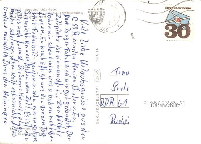 old postcard Trebon Czechia Strand Kirche Gebaeude postalisch gelaufen Erhaltung siehe scans