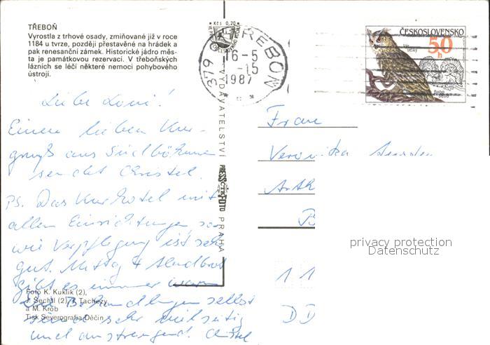 old postcard Trebon Czechia Vyrostla z trhove osady zminovane jiz v roce pozdeji prestavene na hradek a pak renesancni zamek Historicke jadro mesta je pamatkovou rezervaci postalisch gelaufen Erhaltung siehe scans