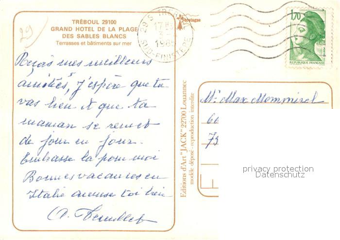 13288082 carte postale Treboul Douarnenez Grand Hotel de la Plage des Sables Blancs postalisch gelaufen Erhaltung siehe scans [NatalD47] KatCode: 11170029429046