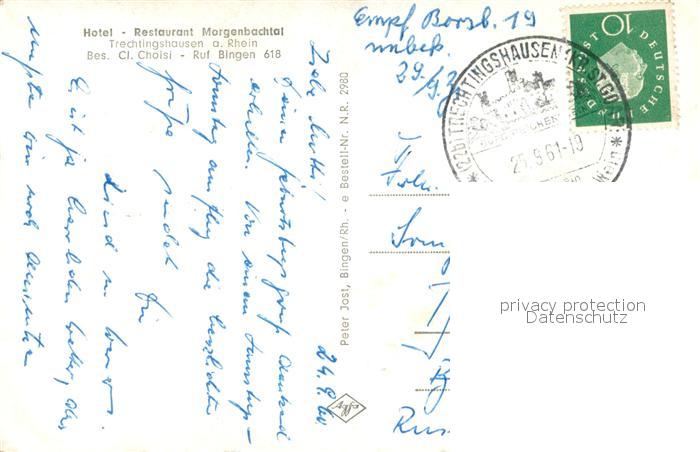 73667416 alte Postkarte Trechtingshausen mit Burg Reichenstein Rheinpartie Burg Rheinstein Hotel Restaurant Morgenbachtal postalisch gelaufen Erhaltung siehe scans [WerneD78] KatCode: 11110007339058