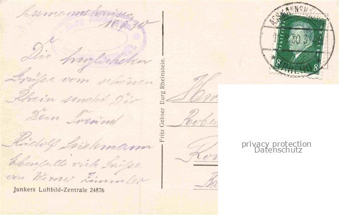 74131697 alte Postkarte Trechtlingshausen Trechtingshausen Mainz-Bingen Rheinland-Pfalz Burg Rheinstein postalisch gelaufen Fliegeraufnahme Erhaltung siehe scans [FriedD77] KatCode: 11110007339058