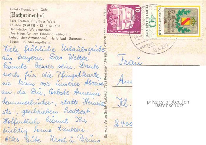 74049767 alte Postkarte Treffelstein Hotel Restaurant Café Katharinenhof Garten Terrasse postalisch gelaufen Erhaltung siehe scans [FriedD77] KatCode: 11110009372165