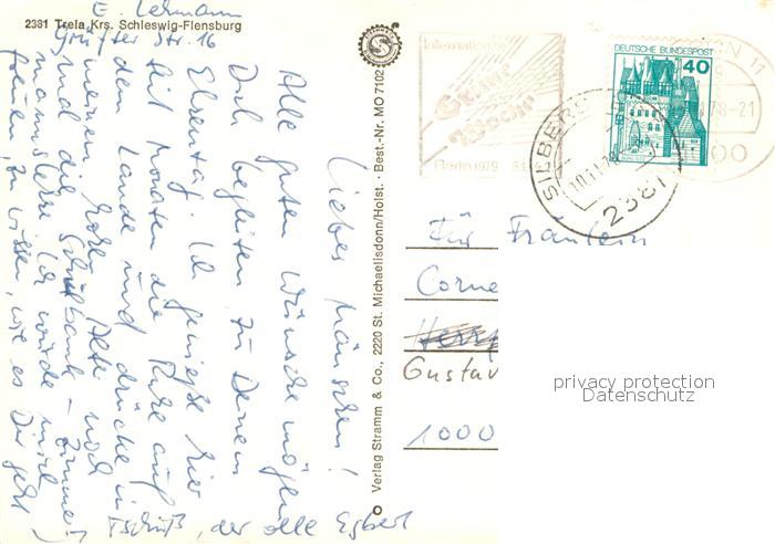 73671541 alte Postkarte Treia Schleswig Gaestehaus Pension Urlaub an der Treene Kirche postalisch gelaufen Erhaltung siehe scans [FriedD77] KatCode: 11110001059092