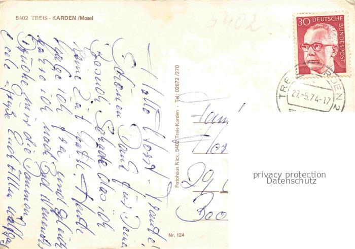 74166648 alte Postkarte Treis-Karden Mosel Rheinland-Pfalz Mosel Weinberge Fliegeraufnahme Flussschleife Stadtansicht Kirche Turm postalisch gelaufen Fliegeraufnahme Erhaltung siehe scans [Karloger] KatCode: 11110007135082