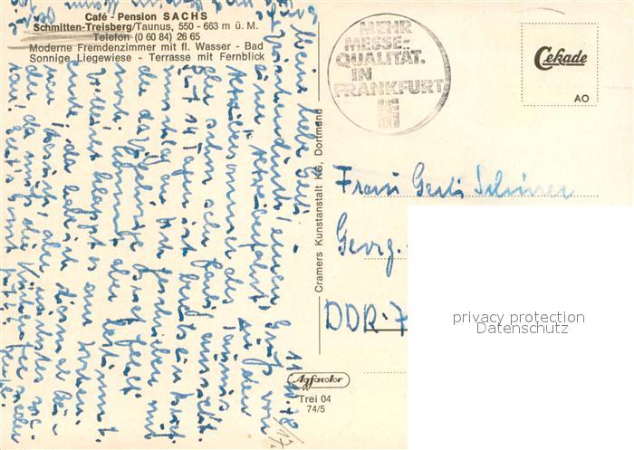 73723160 alte Postkarte Treisberg Cafe Pension Sachs Erholungsort Naturpark Hochtaunus postalisch gelaufen Erhaltung siehe scans [FriedD77] KatCode: 11110006434009