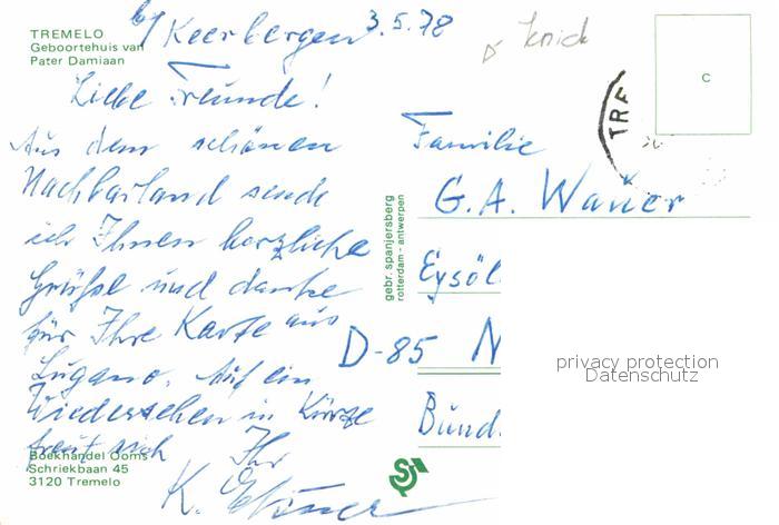 72811888 carte postale Tremelo Geboortehuis van Pater Damiaan postalisch gelaufen Erhaltung siehe scans [WerneD78] KatCode: 11070024001022