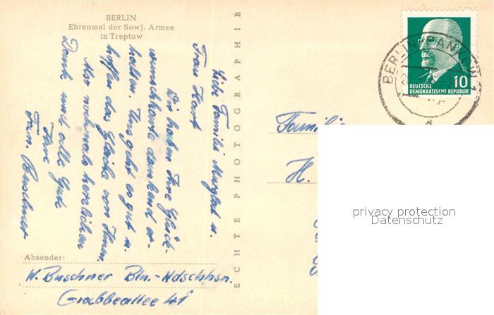 43369194 alte Postkarte Treptow Berlin Sowjetisches Ehrenmal postalisch gelaufen Erhaltung siehe scans [FriedD77] KatCode: 11110011000000