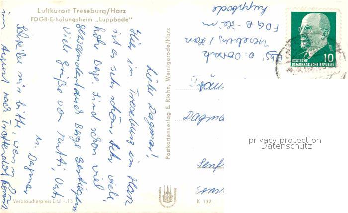 72676081 alte Postkarte Treseburg Harz FDGB Erholungsheim Luppbode postalisch gelaufen Erhaltung siehe scans [FriedD77] KatCode: 11110015085340