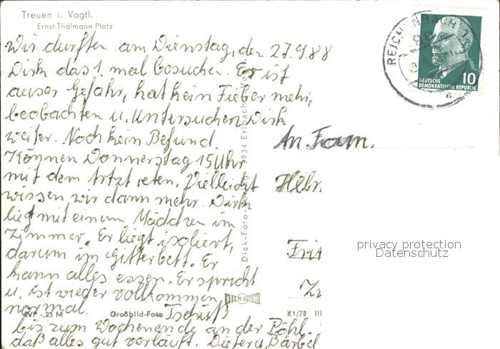 72117602 alte Postkarte Treuen Ernst Thaelmann Platz Brunnen postalisch gelaufen Erhaltung siehe scans KatCode: 11110014178680