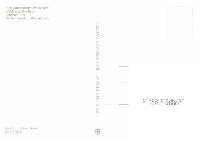 72707886 Treuen Treuener Land Kleingartensparte Waldeslust Waldgaststaette Buch Perlaser Turm Fischerhaeusel am Gloeckelteich postalisch nicht gelaufen Erhaltung siehe scans [WerneD78] KatCode: 11110014178680