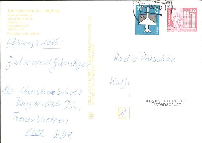 72348263 alte Postkarte Treuenbrietzen Rathaus Sabinchenbrunnen Pulverturm Wasserturm postalisch gelaufen Erhaltung siehe scans KatCode: 11110012069632