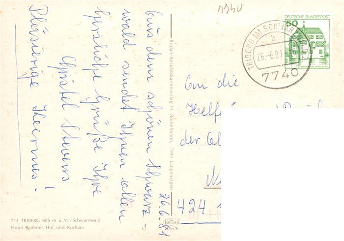 73935378 alte Postkarte Triberg Panorama mit Hotel Badener Hof und Kurhaus postalisch gelaufen Erhaltung siehe scans [WerneD78] KatCode: 11110008326060