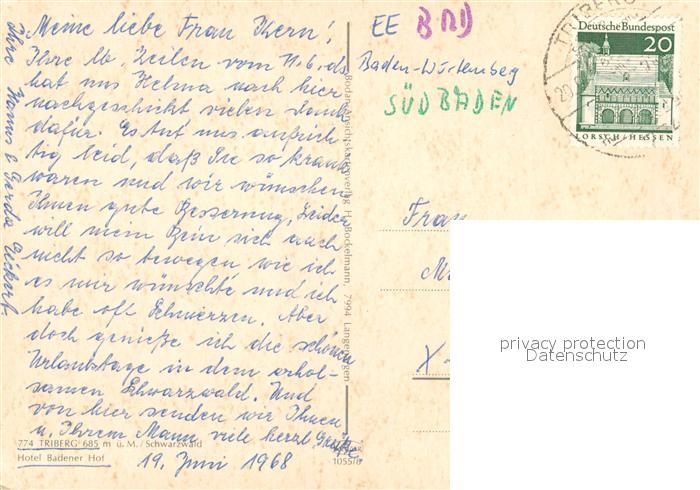 73039827 alte Postkarte Triberg Schwarzwald Hotel Badener Hof postalisch gelaufen Erhaltung siehe scans [WerneD78] KatCode: 11110008326060