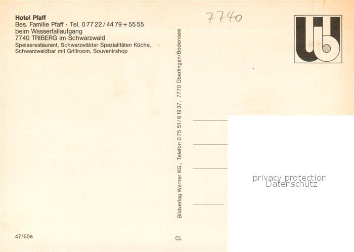 73660962 Triberg Schwarzwald Hotel Pfaff Restaurant Schwarzwaelder Spezialitaeten postalisch nicht gelaufen Erhaltung siehe scans [FriedD77] KatCode: 11110008326060