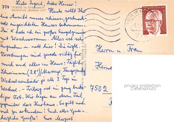 73107403 alte Postkarte Triberg Schwarzwald Sanatorium Badener Hof postalisch gelaufen Erhaltung siehe scans [NatalD47] KatCode: 11110008326060