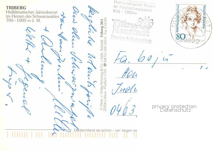 72856435 alte Postkarte Triberg Schwarzwald Teilansichten Narrenbrunnen Wasserfaelle Kirchen postalisch gelaufen Erhaltung siehe scans [WerneD78] KatCode: 11110008326060