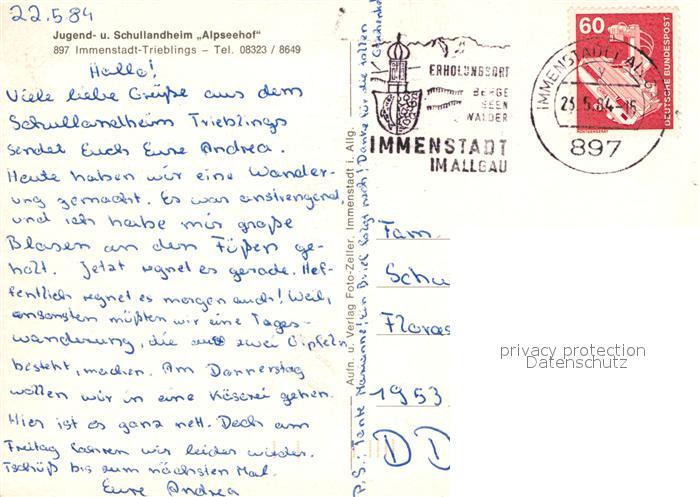 72991245 alte Postkarte Trieblings Jugend und Schullandheim Alpseehof postalisch gelaufen Erhaltung siehe scans [WerneD78] KatCode: 11110009780124