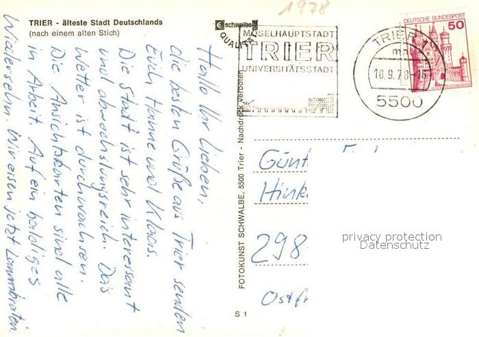 73139533 alte Postkarte Trier aelteste Stadt Deutschlands nach einem alten Stich Kuenstlerkarte postalisch gelaufen Erhaltung siehe scans [FriedD77] KatCode: 11110007211000