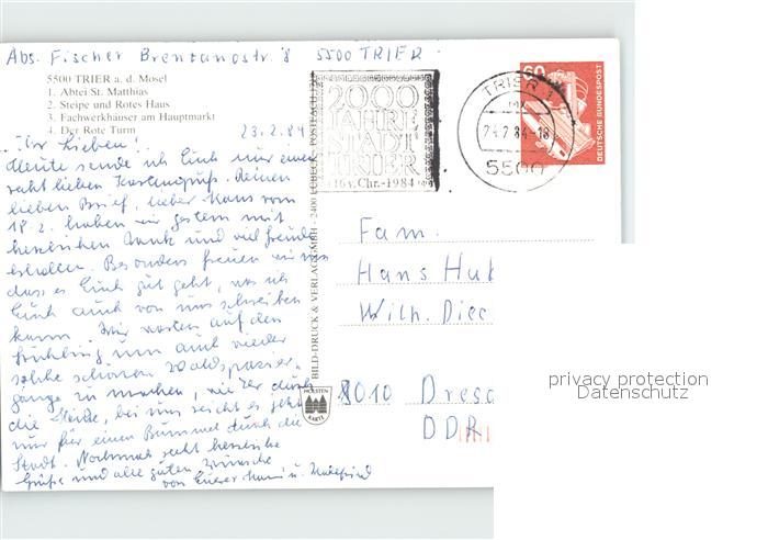72362275 alte Postkarte TRIER CITY Abtei St. Matthias Steipe und Rotes Haus postalisch gelaufen Erhaltung siehe scans KatCode: 11110007211000