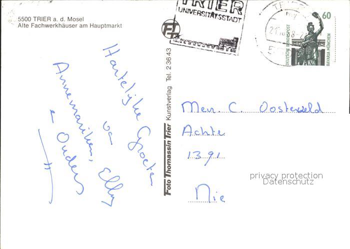72222026 alte Postkarte TRIER CITY Alte Fachwerkhaeuser Hauptmarkt postalisch gelaufen Erhaltung siehe scans KatCode: 11110007211000