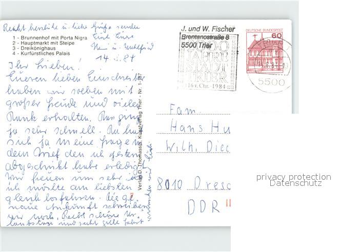 72362273 alte Postkarte TRIER CITY Brunnenhof mit Porta-Nigra Dreikoenighaus Palais postalisch gelaufen Erhaltung siehe scans KatCode: 11110007211000