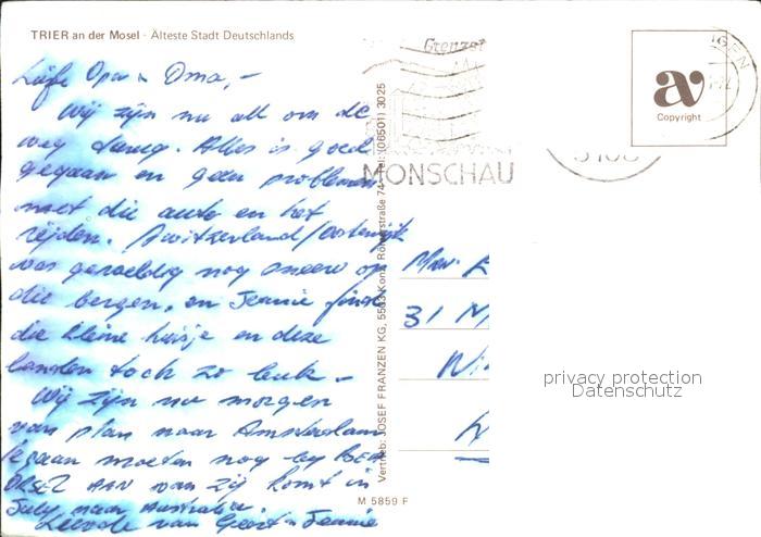72273069 alte Postkarte TRIER CITY Mariensaeule Dreikoenigenhaus Simeonstrasse Hauptmarkt Dom postalisch gelaufen Erhaltung siehe scans KatCode: 11110007211000