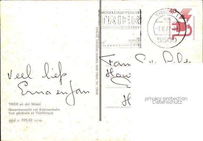 72579137 alte Postkarte TRIER CITY Moselpartie mit Kabinenbahnen postalisch gelaufen Erhaltung siehe scans [LiesaD40] KatCode: 11110007211000