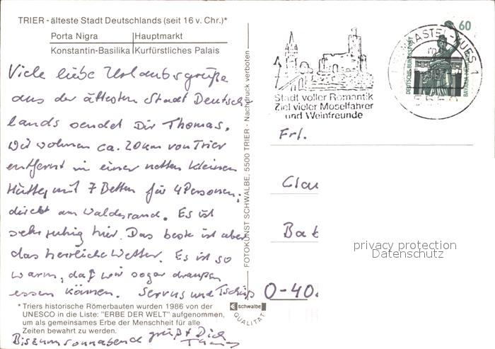 72367029 alte Postkarte TRIER CITY Porta Nigra Hauptmarkt Konstantin Basilika Kurfuerstliches Palais Nachaufnahmen Historische Roemerbauten postalisch gelaufen Erhaltung siehe scans KatCode: 11110007211000