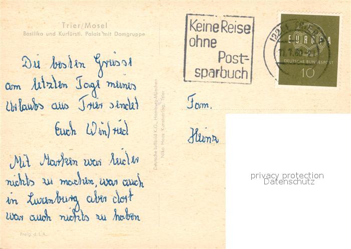 73088615 alte Postkarte Trier Fliegeraufnahme Basilika Kurfuerstl. Palais Domgruppe postalisch gelaufen Erhaltung siehe scans [NatalD47] KatCode: 11110007211000