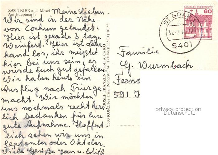 73311358 alte Postkarte Trier Hauptmarkt postalisch gelaufen Erhaltung siehe scans [KathaD81] KatCode: 11110007211000