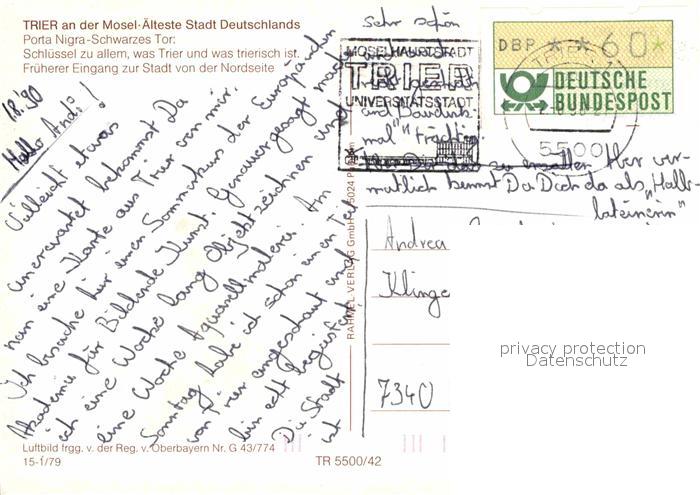 72895502 alte Postkarte Trier Porta Nigra Schwarzes Tor Fliegeraufnahme postalisch gelaufen Erhaltung siehe scans [WerneD78] KatCode: 11110007211000