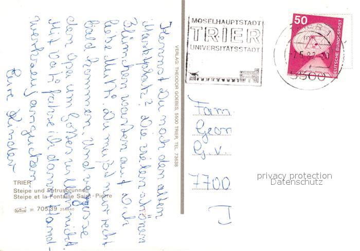 73606357 alte Postkarte Trier Steipe und Petrusbrunnen postalisch gelaufen Erhaltung siehe scans [LiesaD40] KatCode: 11110007211000